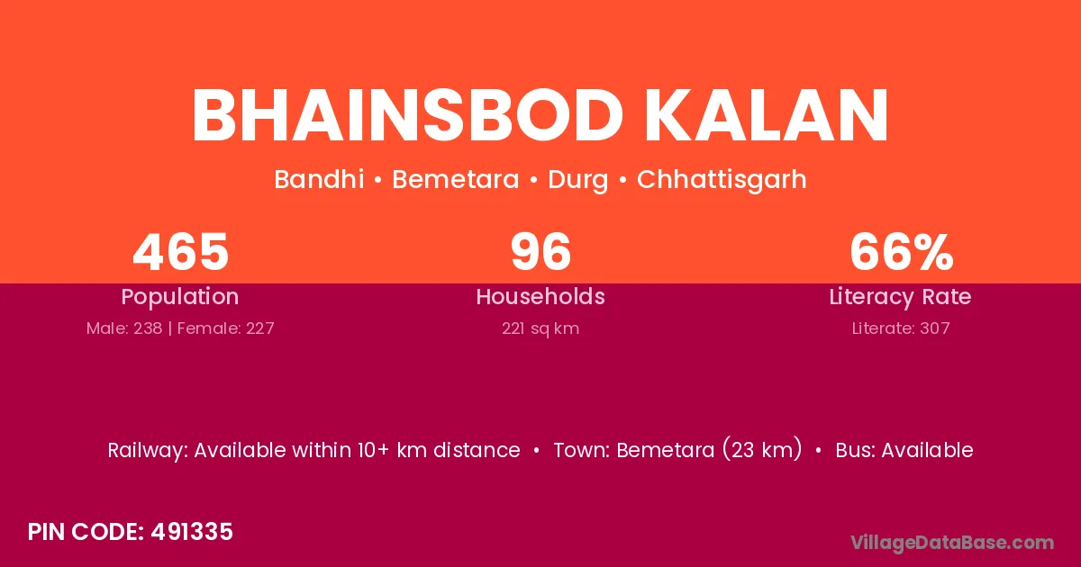 Bemetara (23 km) is the nearest town to Bhainsbod Kalan village for major economic activities and is located approximately 23 km away.
