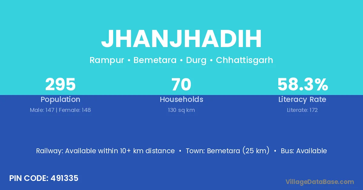 Bemetara (25 km) is the nearest town to Jhanjhadih village for major economic activities and is located approximately 25 km away.