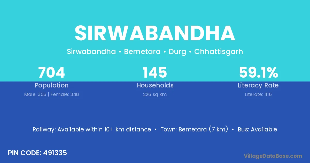 Bemetara (7 km) is the nearest town to Sirwabandha village for major economic activities and is located approximately 7 km away.