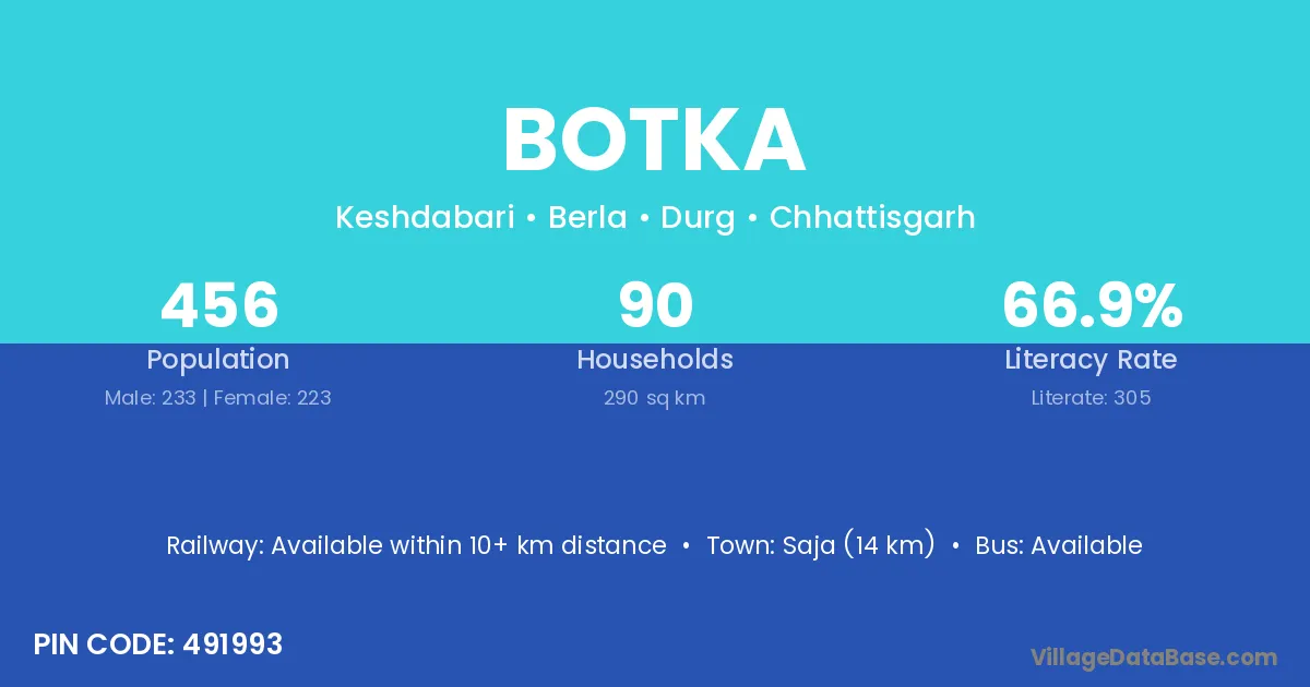 Botka village has a total population of 456 people, of which 233 are males and 223 are females.