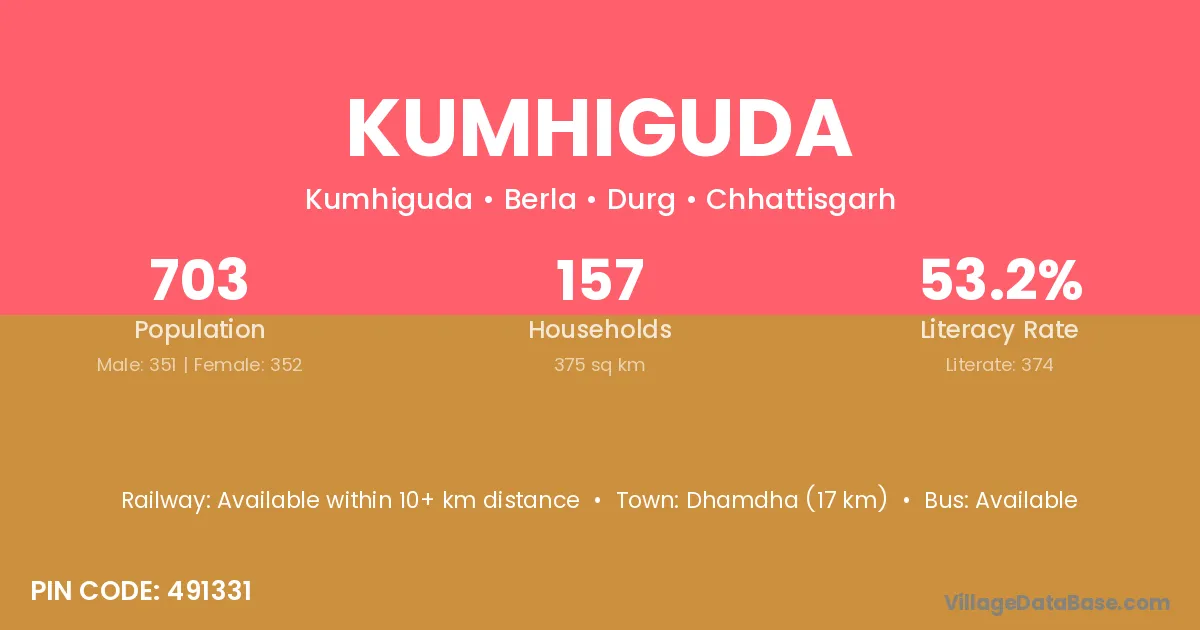 Dhamdha (17 km) is the nearest town to Kumhiguda village for major economic activities and is located approximately 17 km away.
