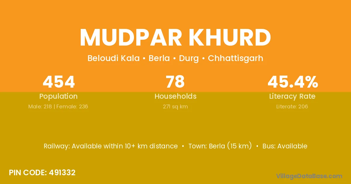 Mudpar Khurd village has a total population of 454 people, of which 218 are males and 236 are females.