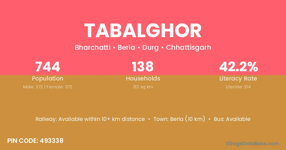 Tabalghor village has a total population of 744 people, of which 372 are males and 372 are females.