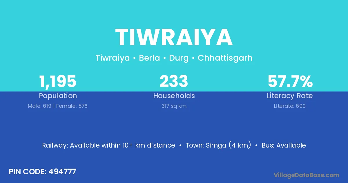 Simga (4 km) is the nearest town to Tiwraiya village for major economic activities and is located approximately 4 km away.
