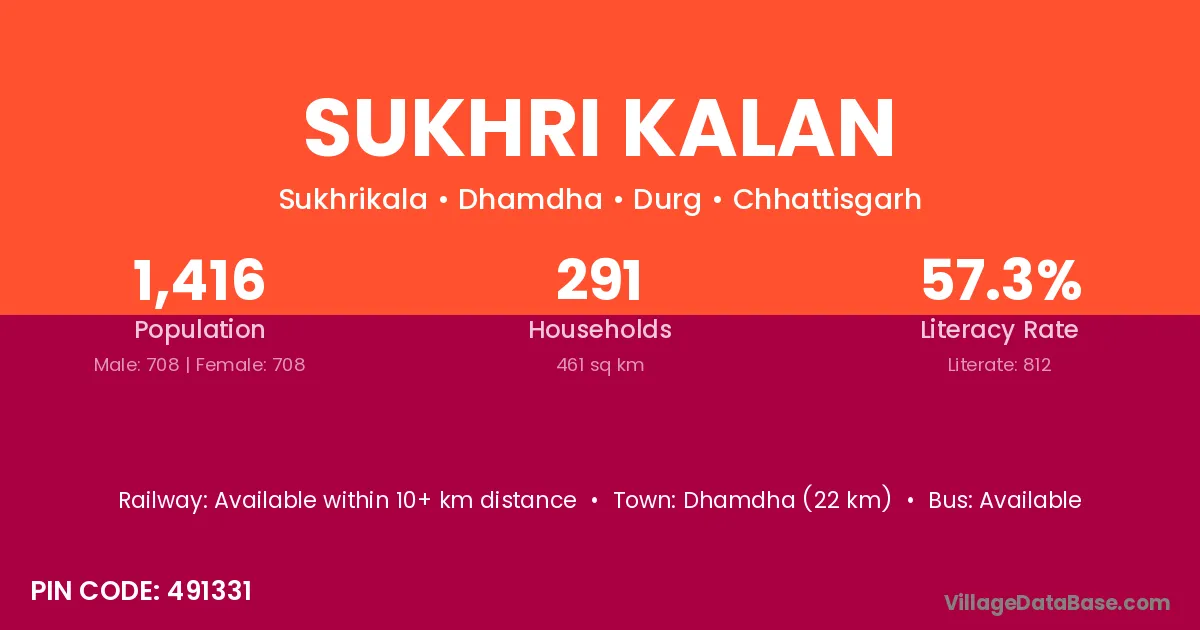 Sukhri Kalan village has a total population of 1,416 people, of which 708 are males and 708 are females.