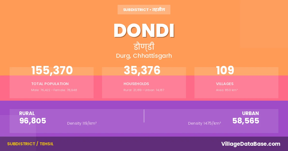 Dondi is a town and Tehsil in the Durg district of the Chhattisgarh. In India, a Tehsil is a subdivision of a district responsible for the administration and revenue collection of a specific area within the district. Tehsils play a crucial role in the local governance structure, contributing significantly to the development and administration of their communities.