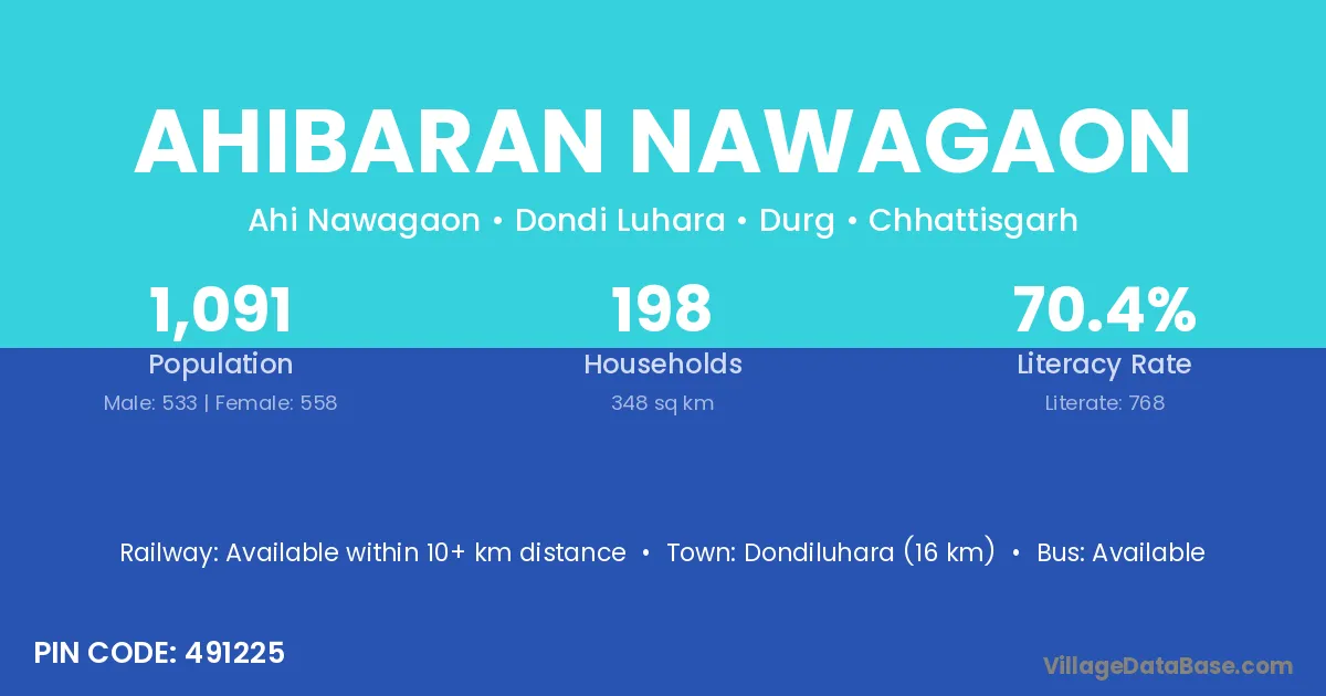 Dondiluhara (16 km) is the nearest town to Ahibaran Nawagaon village for major economic activities and is located approximately 16 km away.