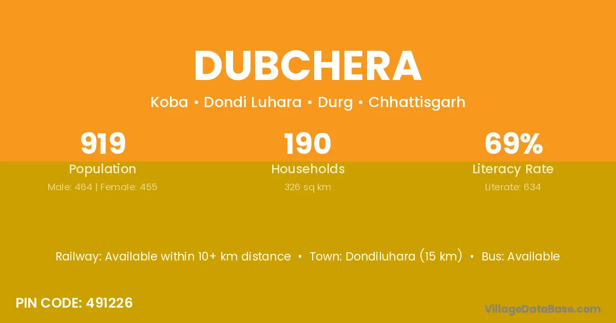 Dondiluhara (15 km) is the nearest town to Dubchera village for major economic activities and is located approximately 15 km away.