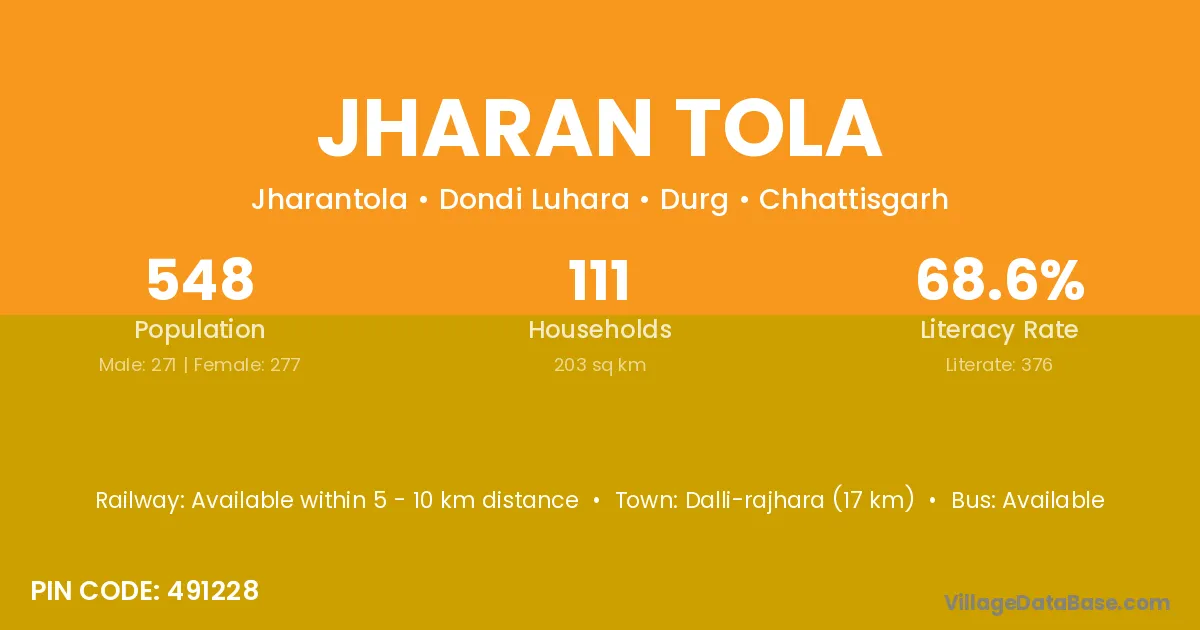 Dalli-rajhara (17 km) is the nearest town to Jharan Tola village for major economic activities and is located approximately 17 km away.