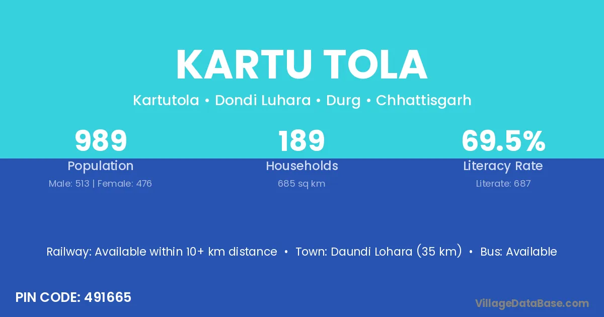 Kartu Tola village has a total population of 989 people, of which 513 are males and 476 are females.