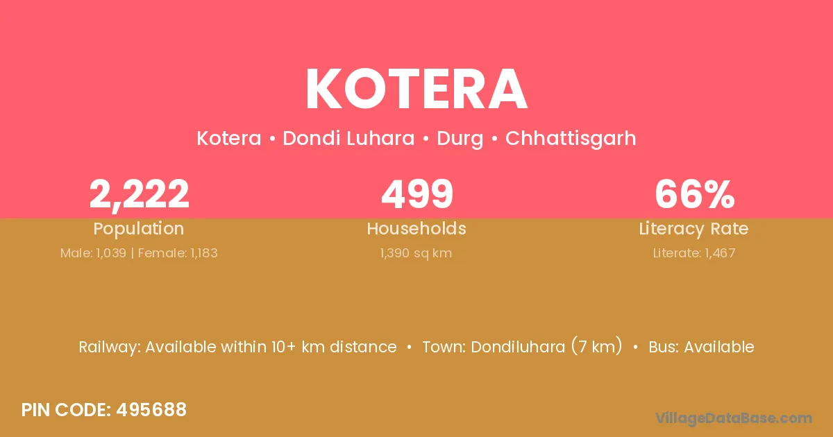Dondiluhara (7 km) is the nearest town to Kotera village for major economic activities and is located approximately 7 km away.