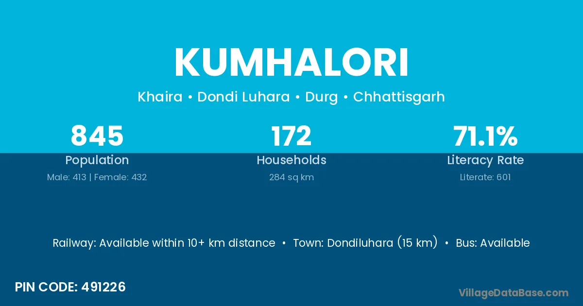 Dondiluhara (15 km) is the nearest town to Kumhalori village for major economic activities and is located approximately 15 km away.