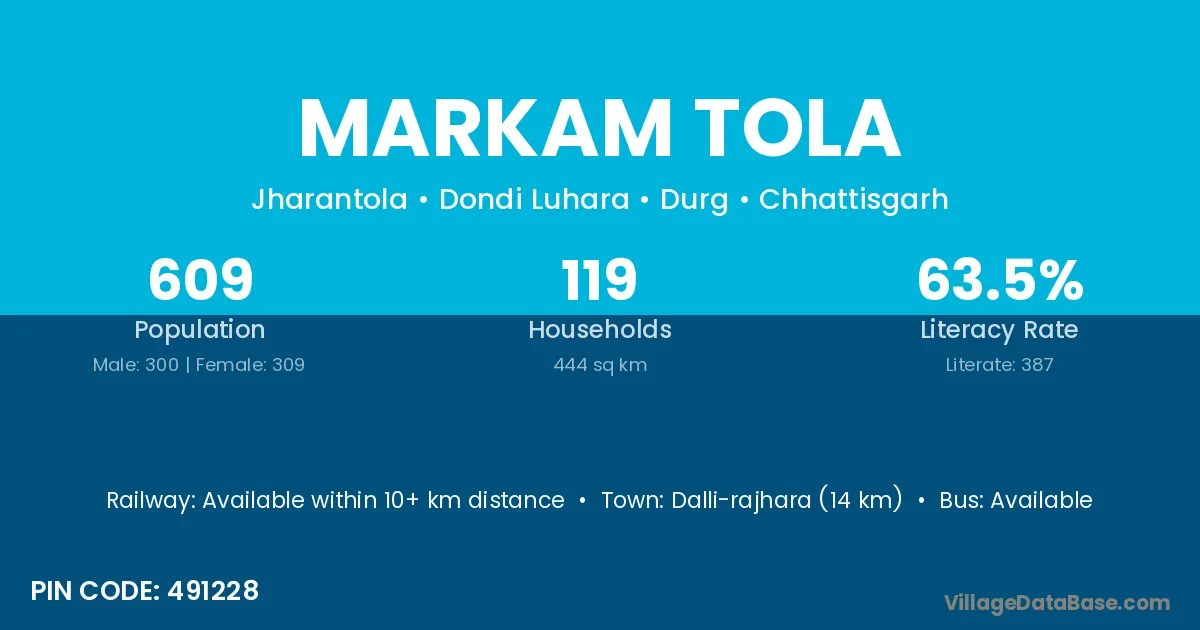 Dalli-rajhara (14 km) is the nearest town to Markam Tola village for major economic activities and is located approximately 14 km away.