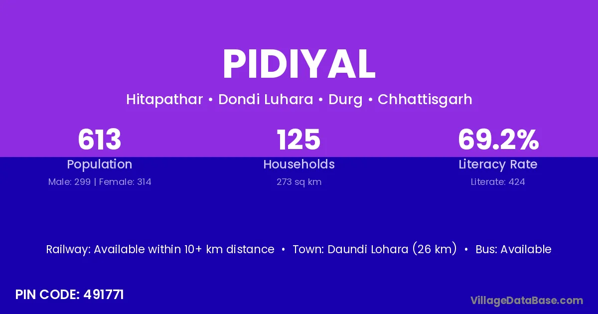 Pidiyal village is located in the Dondi Luhara Tehsil of the Durg district in Chhattisgarh .