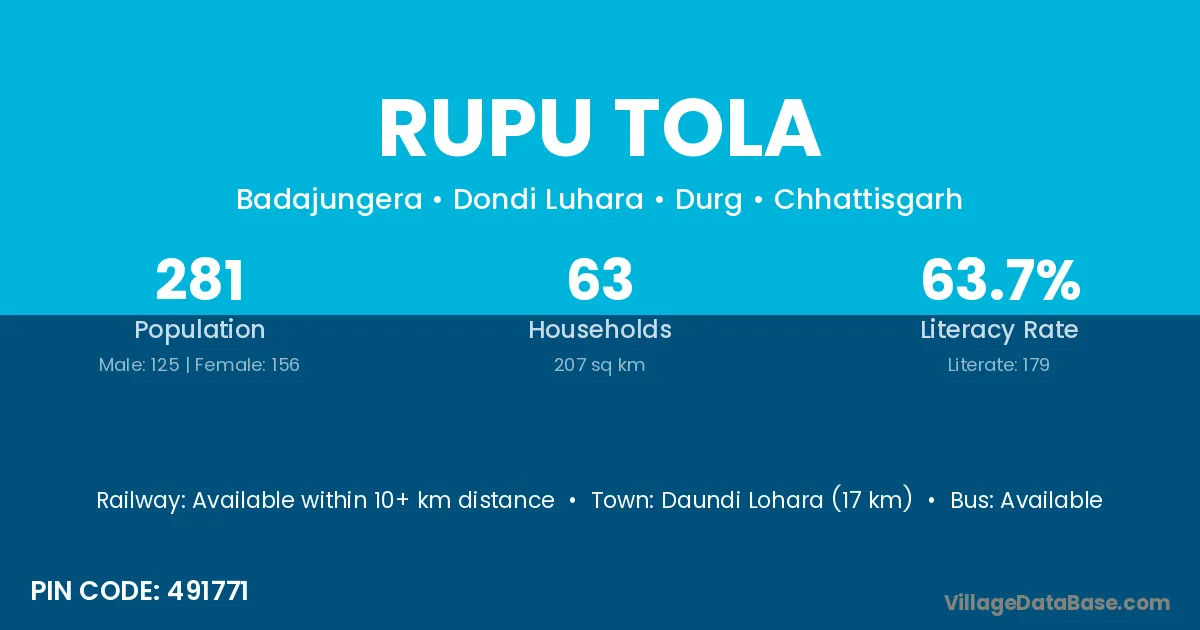 Rupu Tola village has a total population of 281 people, of which 125 are males and 156 are females.