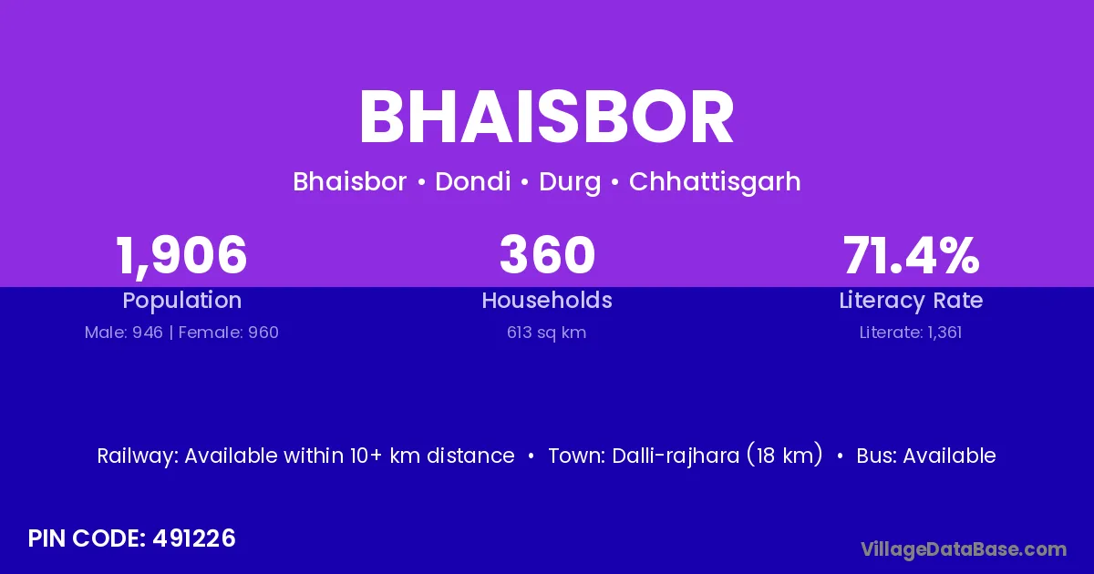 Dalli-rajhara (18 km) is the nearest town to Bhaisbor village for major economic activities and is located approximately 18 km away.