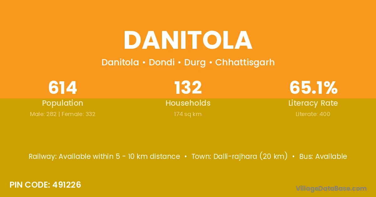 Dalli-rajhara (20 km) is the nearest town to Danitola village for major economic activities and is located approximately 20 km away.
