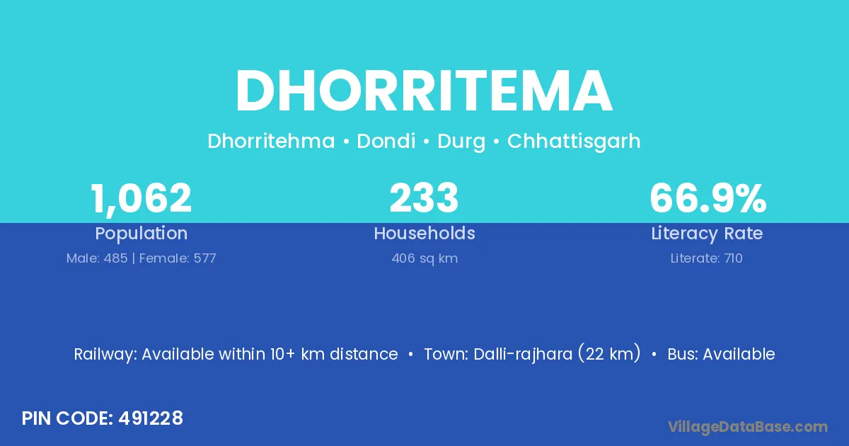 Dalli-rajhara (22 km) is the nearest town to Dhorritema village for major economic activities and is located approximately 22 km away.
