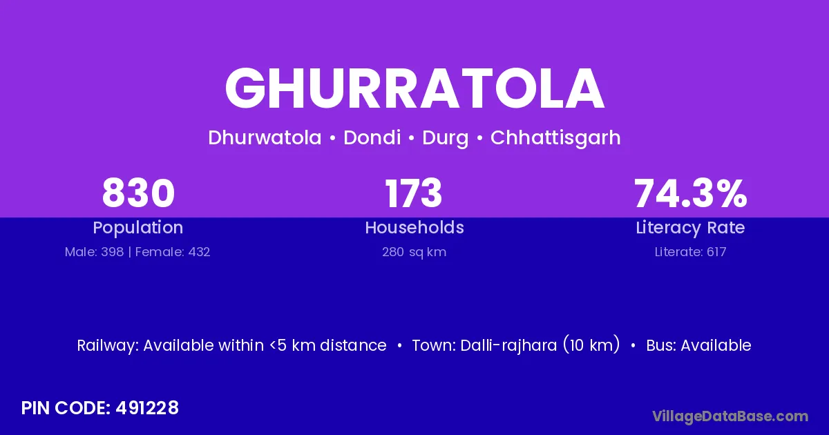 Dalli-rajhara (10 km) is the nearest town to Ghurratola village for major economic activities and is located approximately 10 km away.