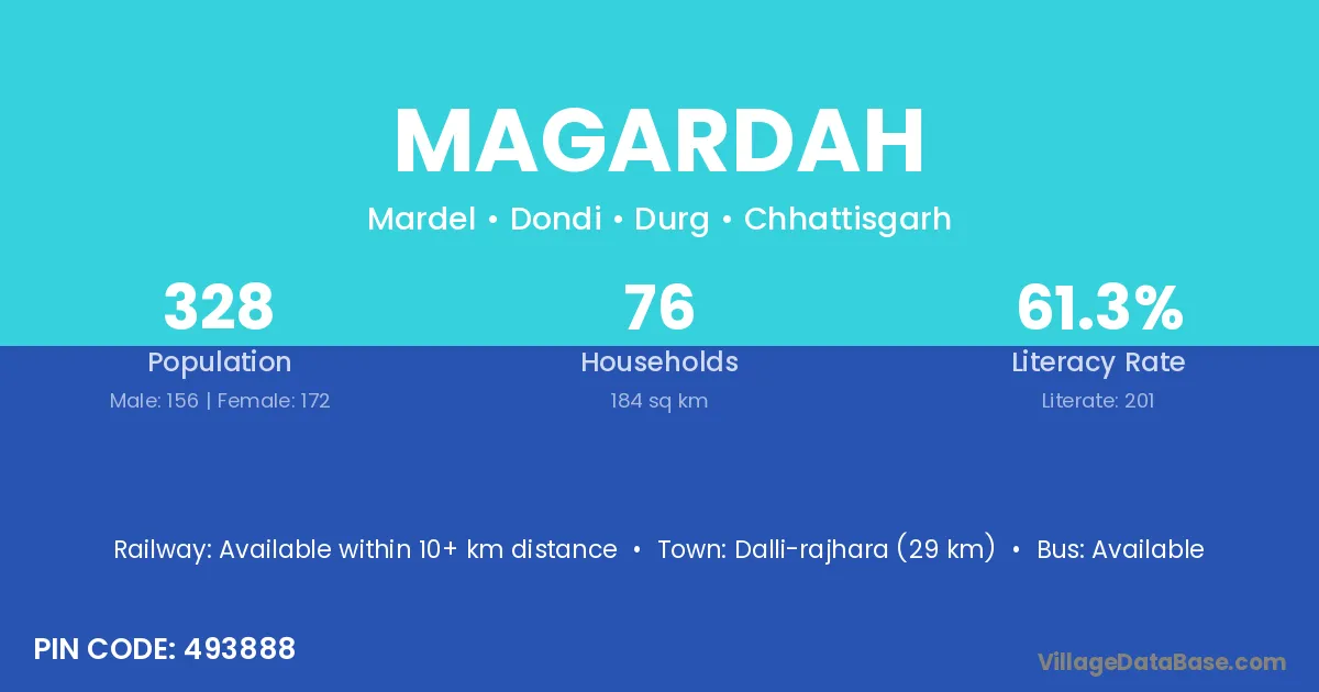 Dalli-rajhara (29 km) is the nearest town to Magardah village for major economic activities and is located approximately 29 km away.