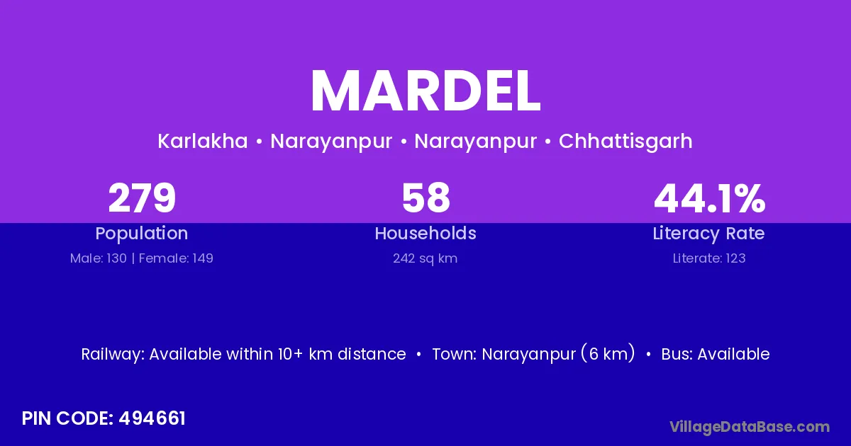 Dalli-rajhara (30 km) is the nearest town to Mardel village for major economic activities and is located approximately 30 km away.
