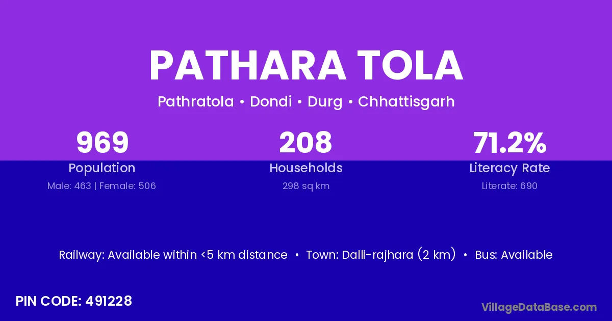 Dalli-rajhara (2 km) is the nearest town to Pathara Tola village for major economic activities and is located approximately 2 km away.
