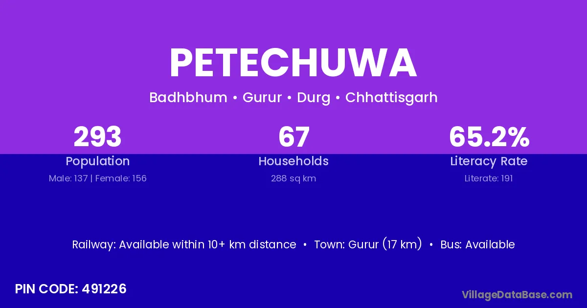 Dalli-rajhara (24 km) is the nearest town to Petechuwa village for major economic activities and is located approximately 24 km away.