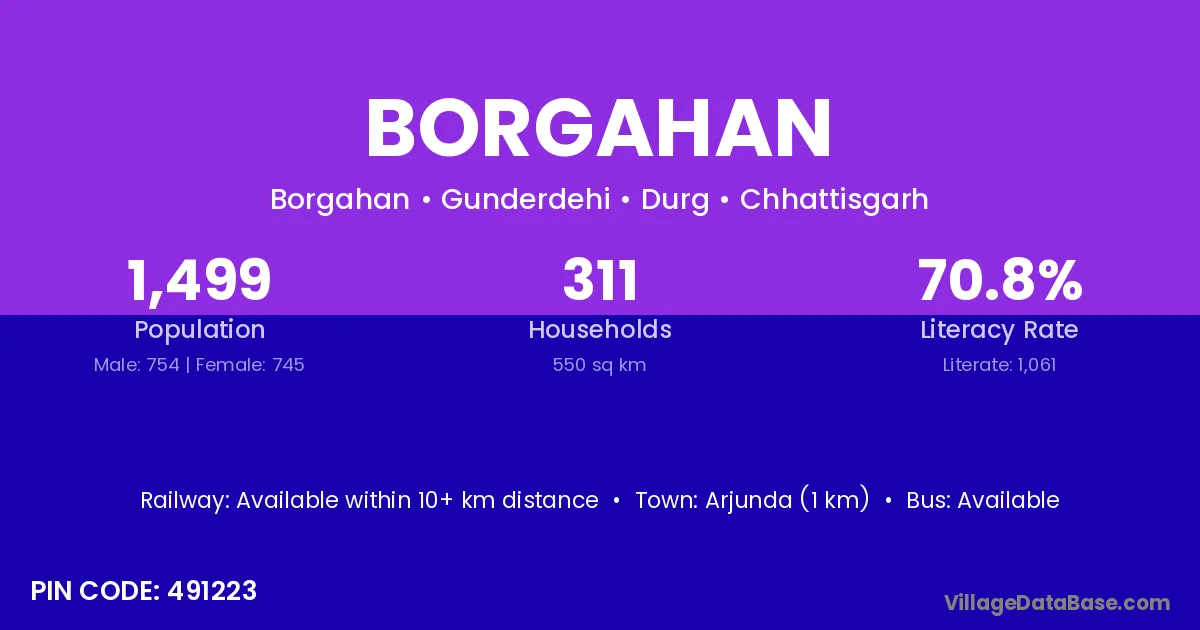 Arjunda (1 km) is the nearest town to Borgahan village for major economic activities and is located approximately 1 km away.