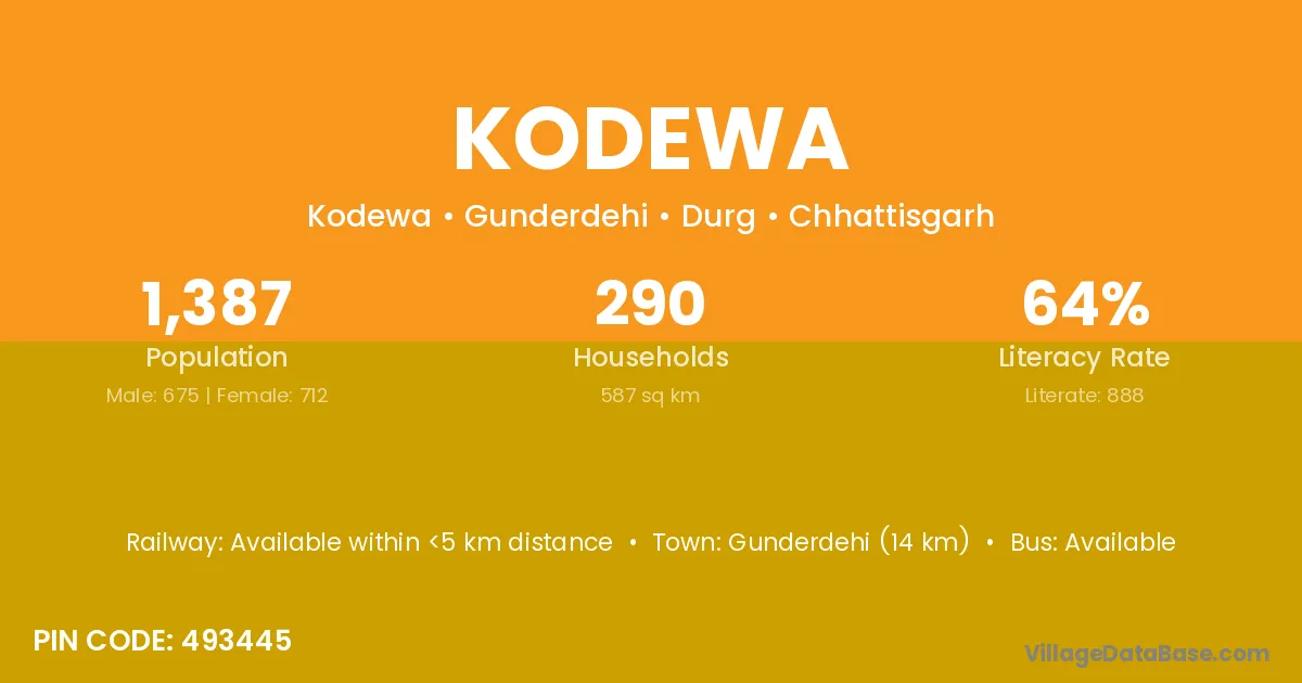 Gunderdehi (14 km) is the nearest town to Kodewa village for major economic activities and is located approximately 14 km away.