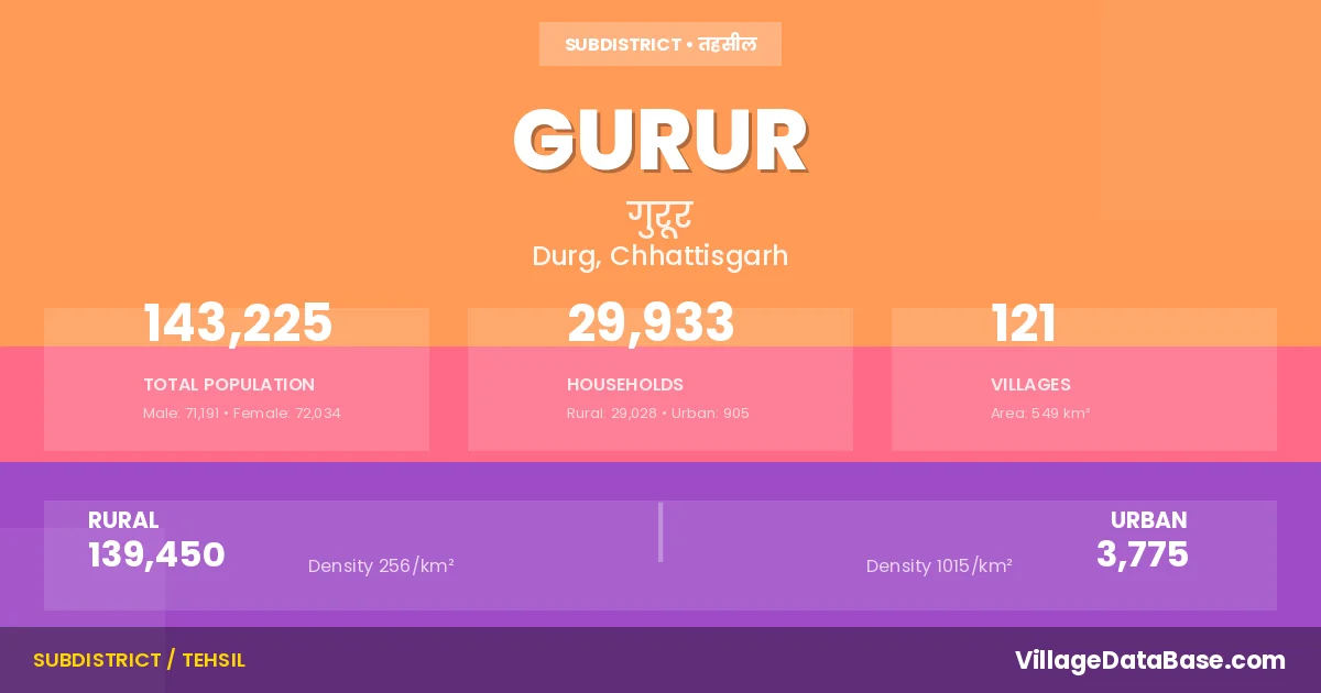 According to the 2011 census The total area of Gurur Tehsil is 549 km², with a population of 143225 people. The population density is 261 inhabitants per square kilometre, and there are approximately 29933 houses in the sub district.
