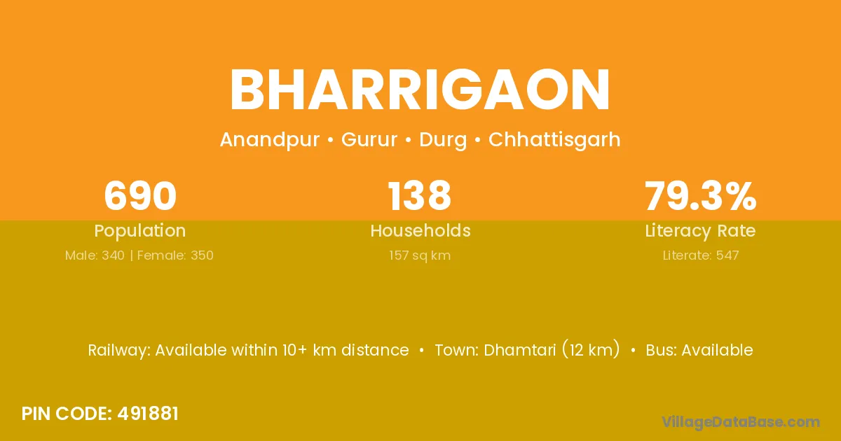 Dhamtari (12 km) is the nearest town to Bharrigaon village for major economic activities and is located approximately 12 km away.