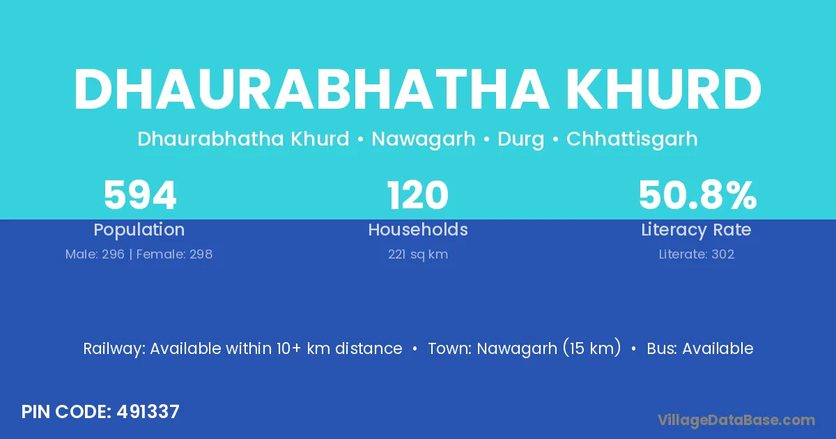 Dhaurabhatha Khurd village has a total population of 594 people, of which 296 are males and 298 are females.