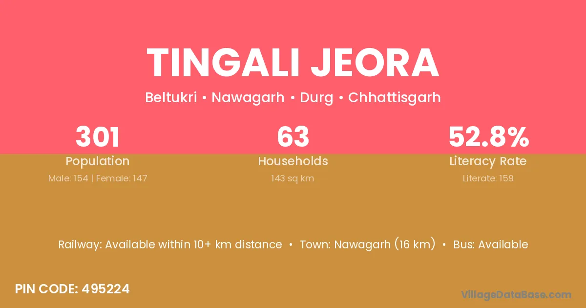 Nawagarh (16 km) is the nearest town to Tingali Jeora village for major economic activities and is located approximately 16 km away.