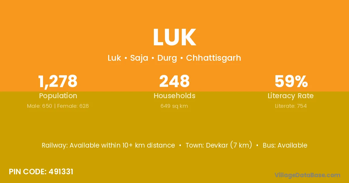 Luk village has a total population of 1,278 people, of which 650 are males and 628 are females.