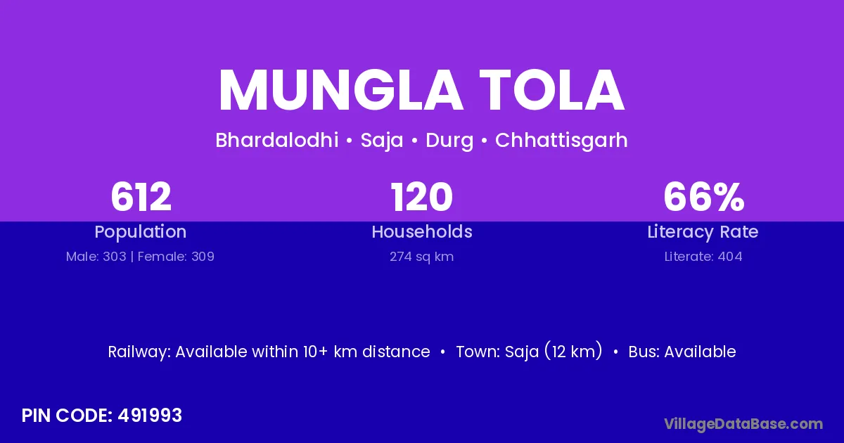 Mungla Tola village has a total population of 612 people, of which 303 are males and 309 are females.