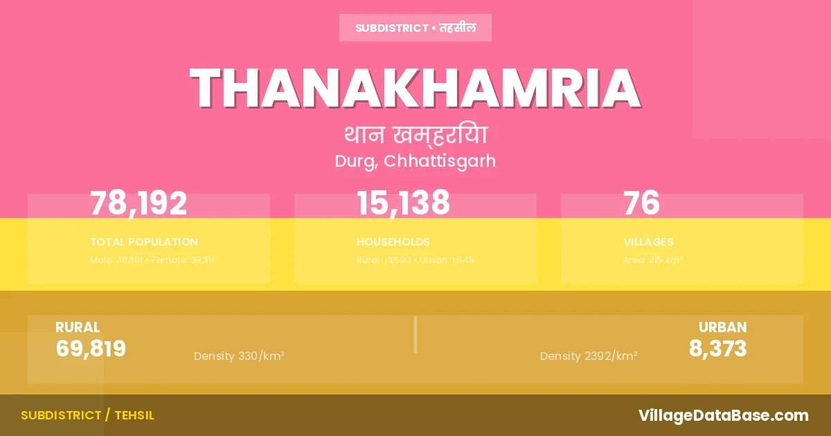 Thanakhamria is a town and Tehsil in the Durg district of the Chhattisgarh. In India, a Tehsil is a subdivision of a district responsible for the administration and revenue collection of a specific area within the district. Tehsils play a crucial role in the local governance structure, contributing significantly to the development and administration of their communities.