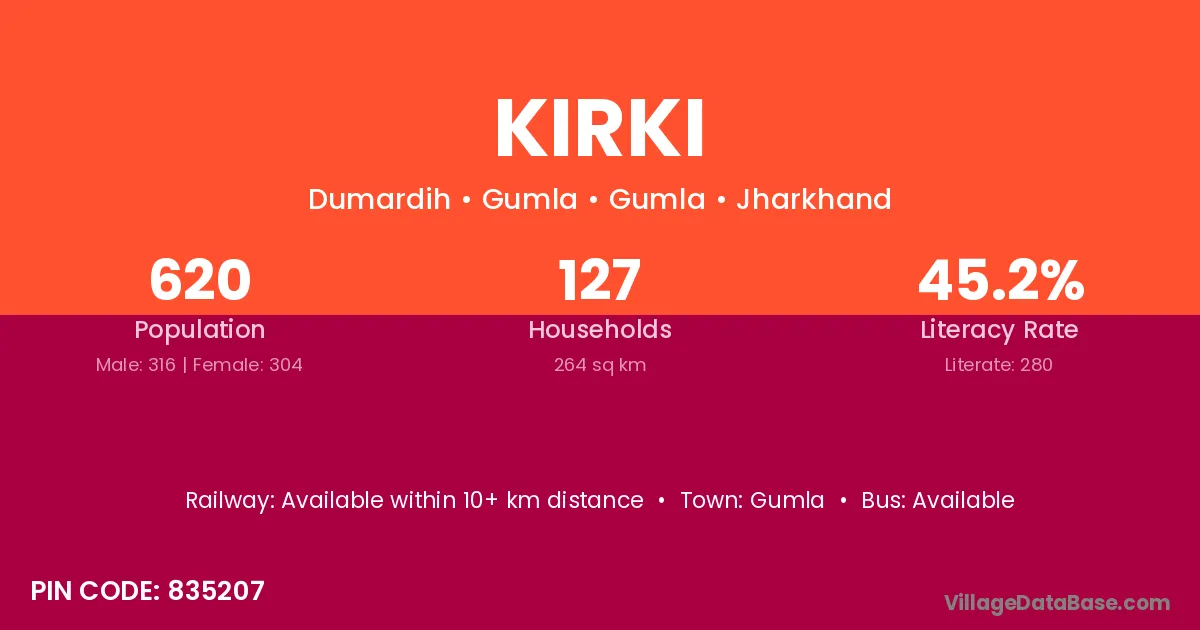 Kirki village has a total population of 1,174 people, of which 573 are males and 601 are females.