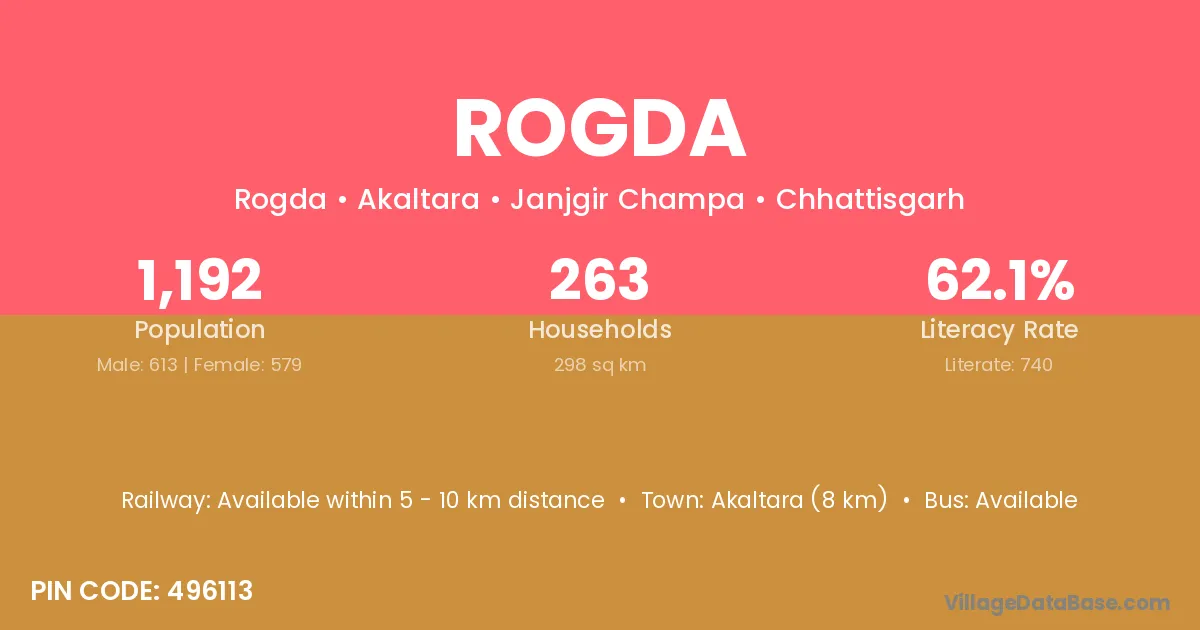 Akaltara (8 km) is the nearest town to Rogda village for major economic activities and is located approximately 8 km away.