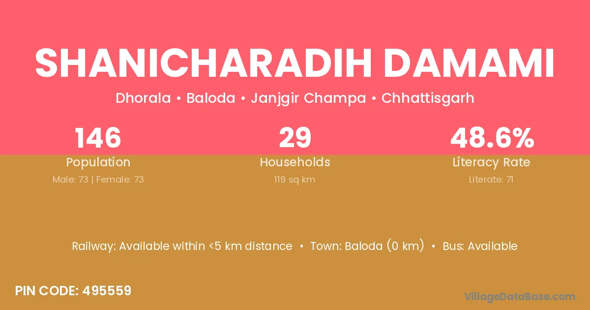 Shanicharadih Damami village has a total population of 146 people, of which 73 are males and 73 are females.