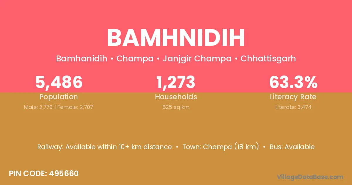 Champa (18 km) is the nearest town to Bamhnidih village for major economic activities and is located approximately 18 km away.