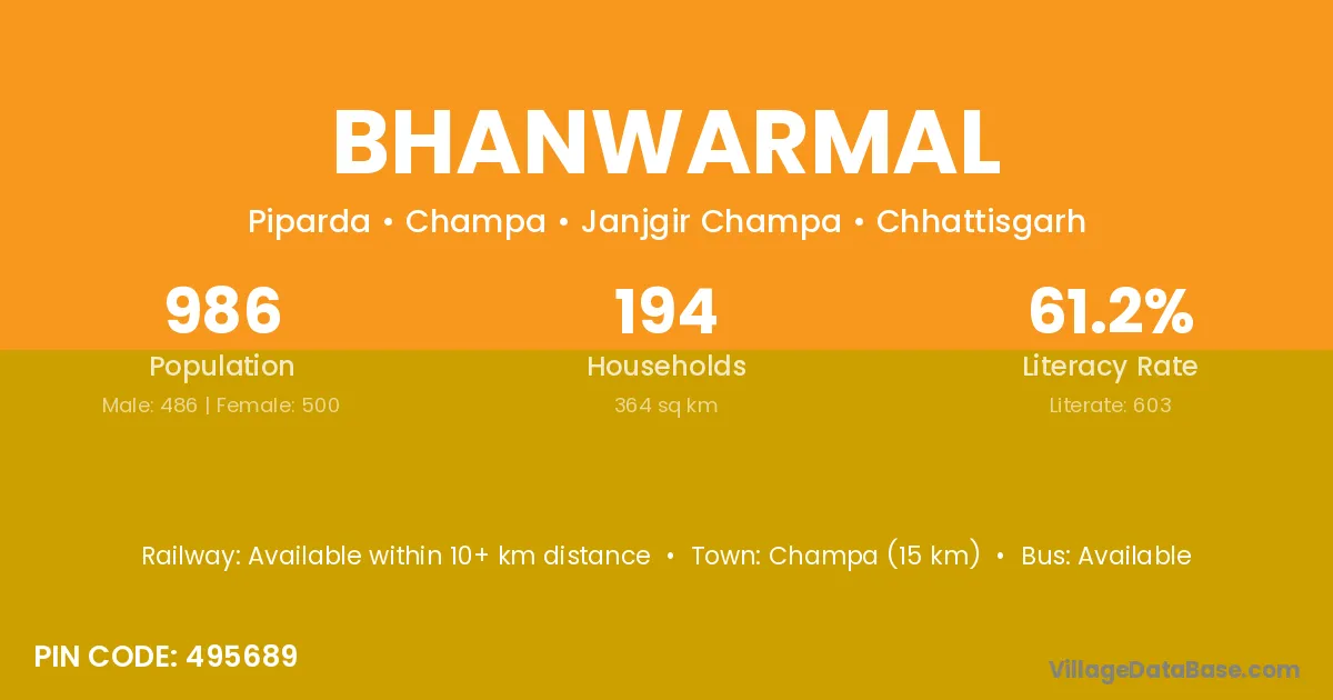 Champa (15 km) is the nearest town to Bhanwarmal village for major economic activities and is located approximately 15 km away.