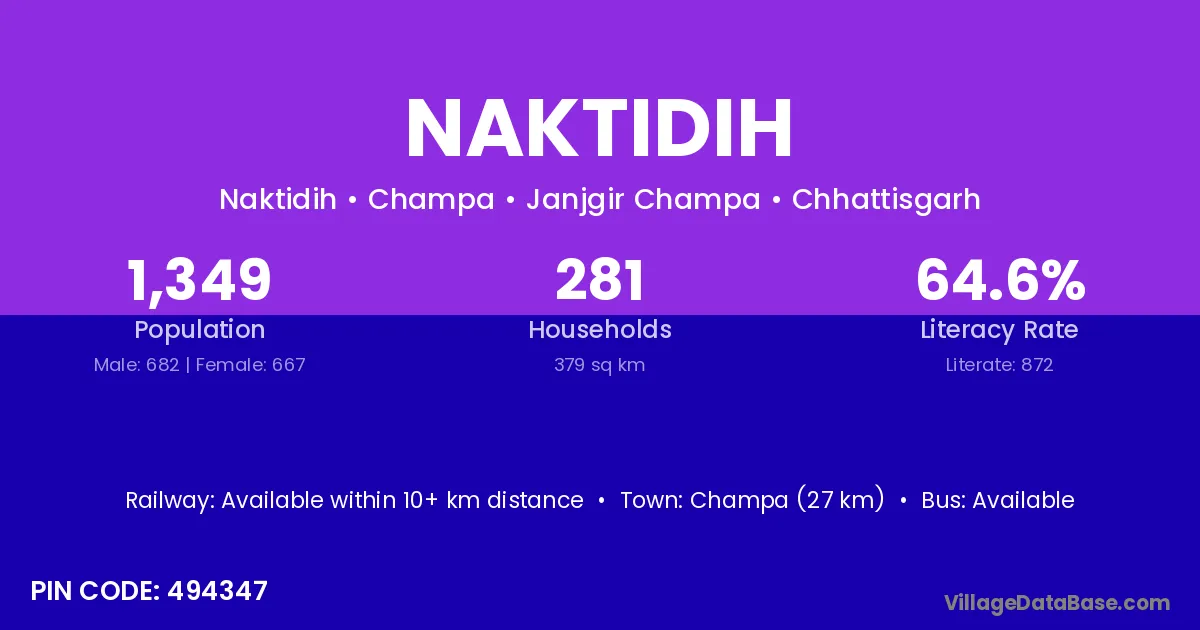 Naktidih village has a total population of 1,349 people, of which 682 are males and 667 are females.
