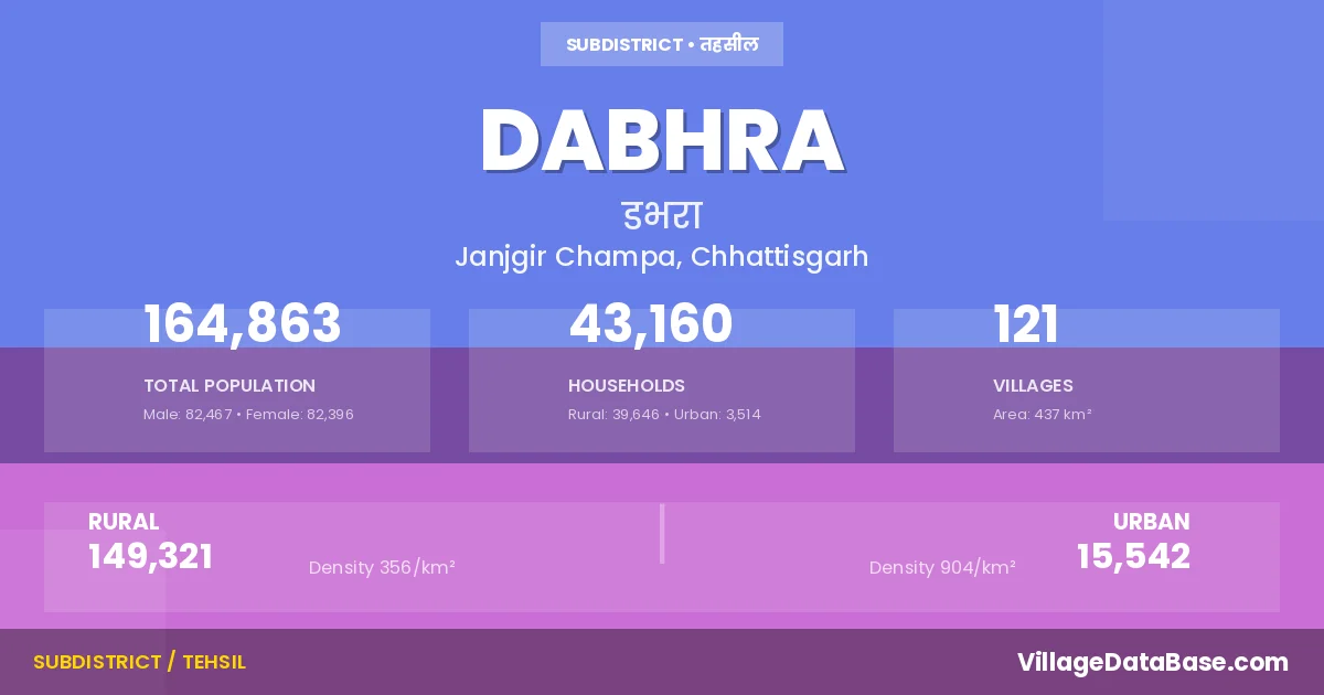 Dabhra is a town and Tehsil in the Janjgir Champa district of the Chhattisgarh. In India, a Tehsil is a subdivision of a district responsible for the administration and revenue collection of a specific area within the district. Tehsils play a crucial role in the local governance structure, contributing significantly to the development and administration of their communities.