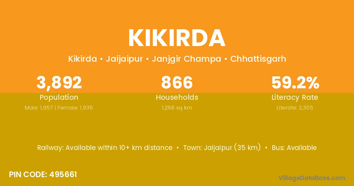 Jaijaipur (35 km) is the nearest town to Kikirda village for major economic activities and is located approximately 35 km away.
