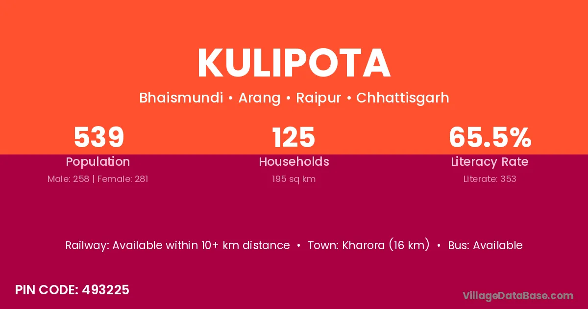 Naila-janjgir (3 km) is the nearest town to Kulipota village for major economic activities and is located approximately 3 km away.