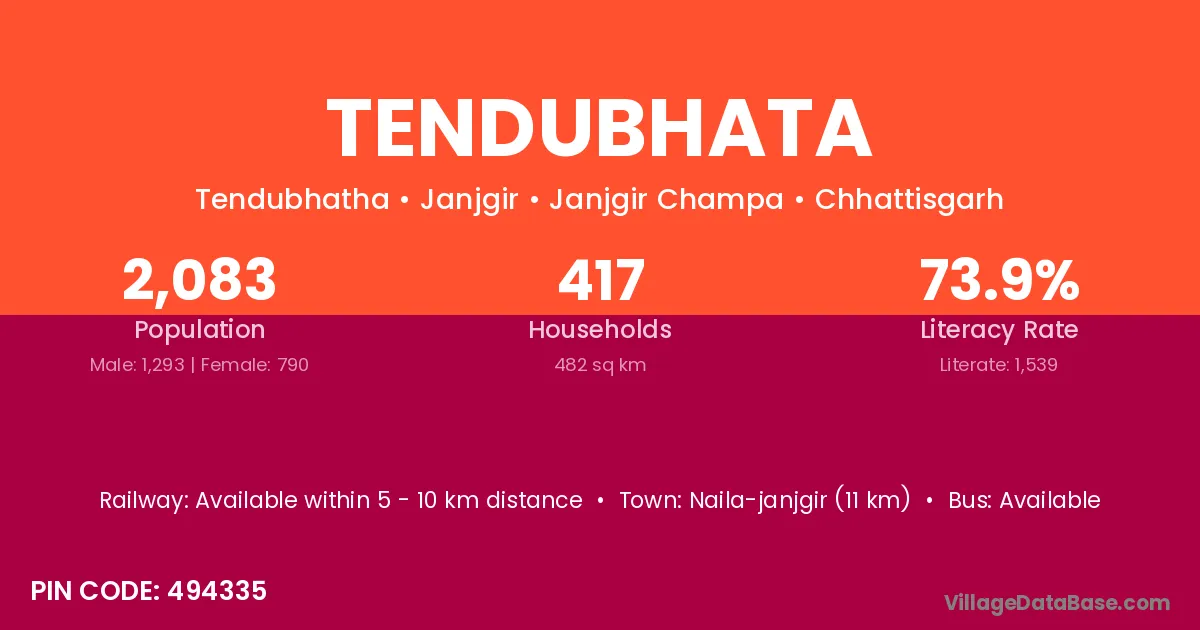 Naila-janjgir (11 km) is the nearest town to Tendubhata village for major economic activities and is located approximately 11 km away.