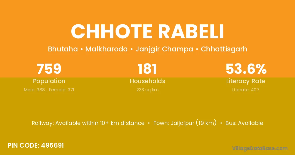 Jaijaipur (19 km) is the nearest town to Chhote Rabeli village for major economic activities and is located approximately 19 km away.