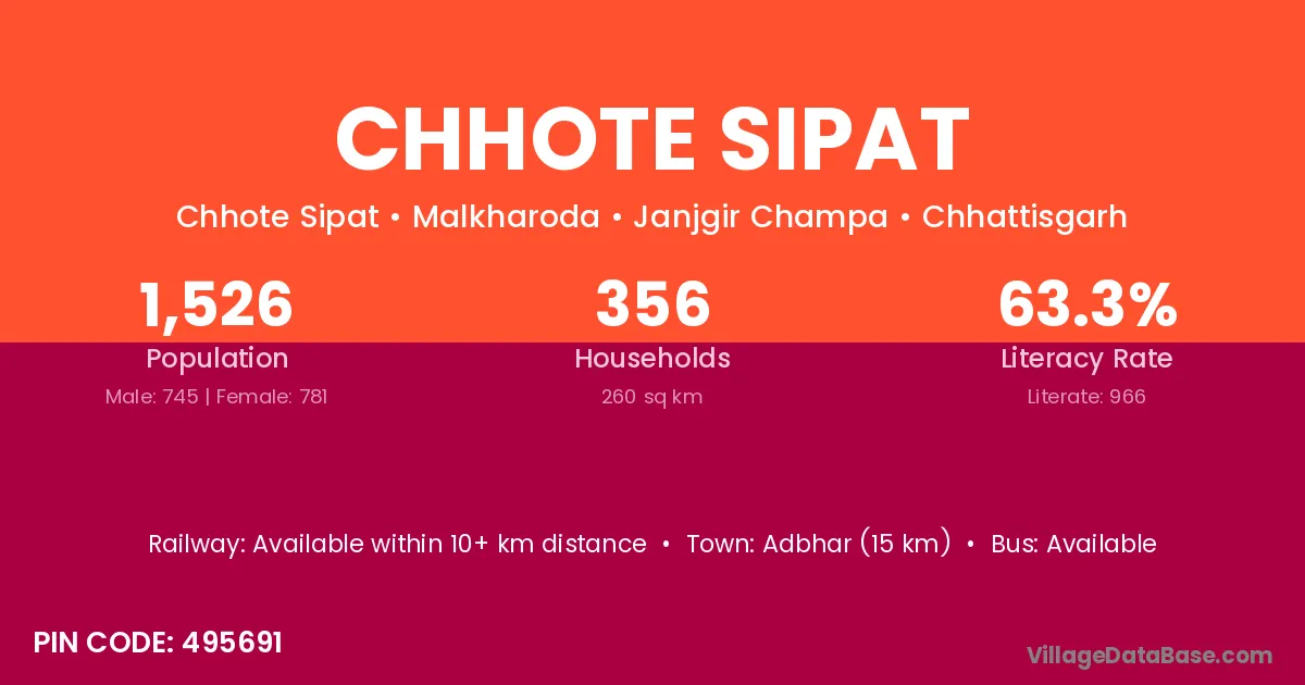 Chhote Sipat village has a total population of 1,526 people, of which 745 are males and 781 are females.
