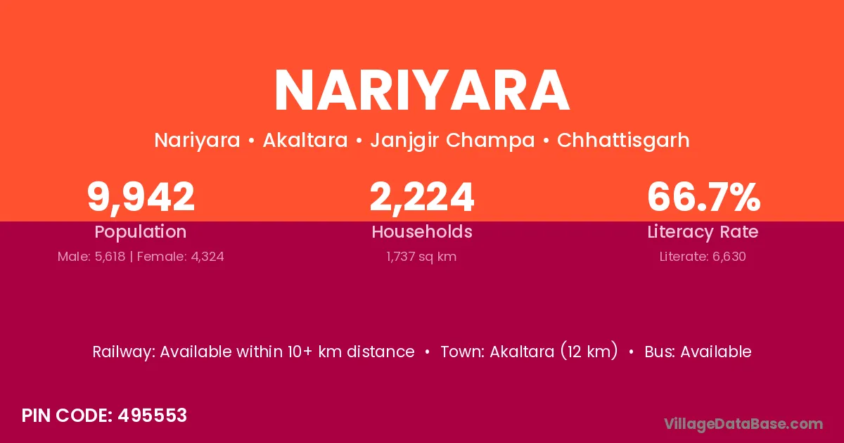 Sakti (42 km) is the nearest town to Nariyara village for major economic activities and is located approximately 42 km away.