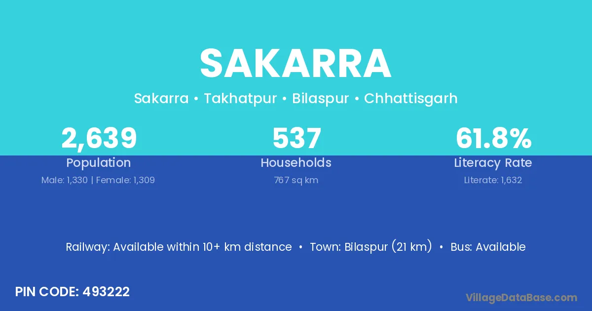 Sakti (10 km) is the nearest town to Sakarra village for major economic activities and is located approximately 10 km away.